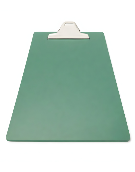Este producto es una planillera en plástico de tamaño oficio y color azul. Tiene un gancho de presión para sujetar las hojas y un clip metálico para colgarla. Es resistente y liviana.
